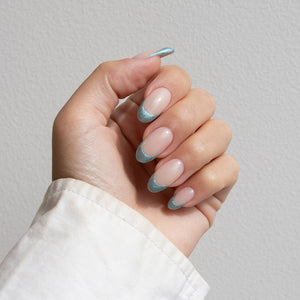 Start by applying and curing Base Coat, optional Colour Coat, and Top Coat. Wipe your nail with a Pure Acetone Wipe, then dab Chrome Powder onto your nail. Dust off excess with the Dust Brush, lightly file the underside of the free edge, and finish with two thin coats of Top Coat, curing after each coat.