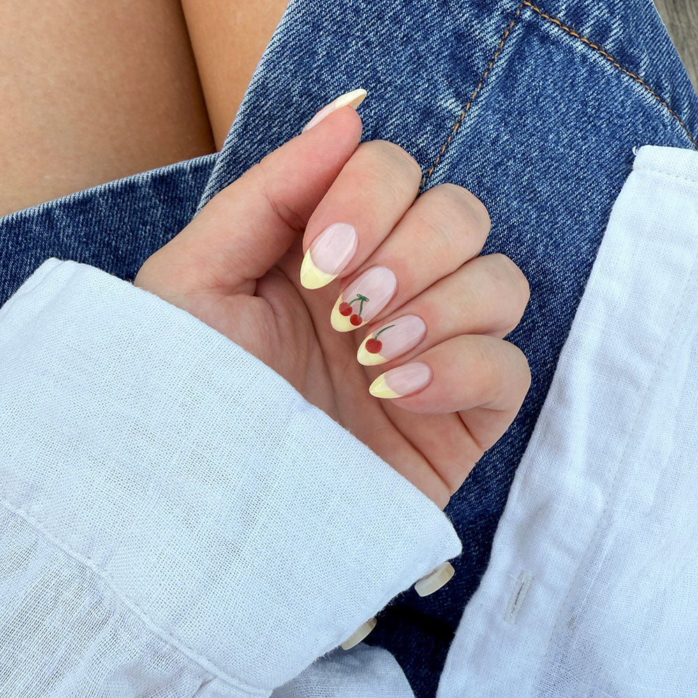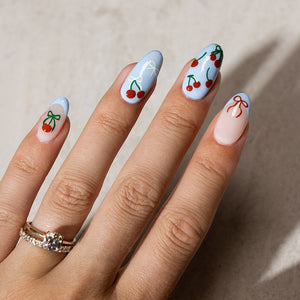 The two trendiest nail art motifs, cherries and bows, as sweet embossed stickers.