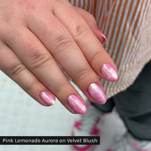 Take your manicure out of this world with our dazzling Pink Lemonade Aurora Chrome Powder. This easy-to-apply, highly pigmented Chrome Powder boasts a magical shine and allows for multiple stunning looks with just one product, as each base colour produces a unique colour and effect.